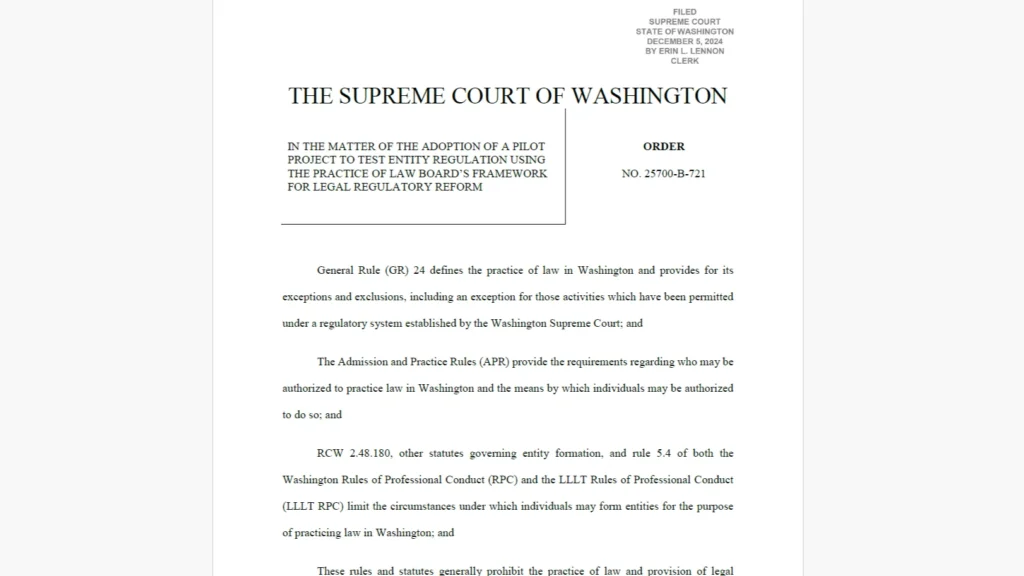 The Washington Supreme Court has approved a pilot program to permit entities not owned by lawyers, including companies and nonprofit organizations, to provide legal services under specific monitoring conditions. This initiative follows similar regulatory reform efforts undertaken in Utah and Arizona. Overview of the Court’s Order The court’s order (Order 25700-B-721), dated December 5, formally […]